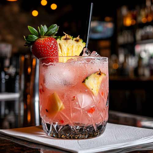 J35 Strawberry Moonshine, fresh strawberries, pineapple juice, and Sprite.Garnished with a lemon wheel.
