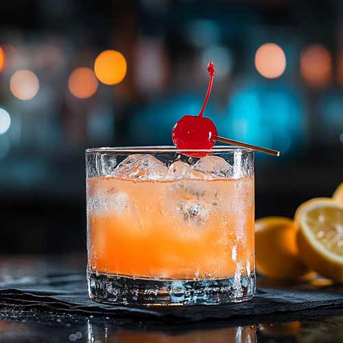 J35 Black Cherry Whiskey, lemon juice, simple syrup, lemonade, and cherry juice. Garnished with a lemon wheel and a Bordeaux cherry.