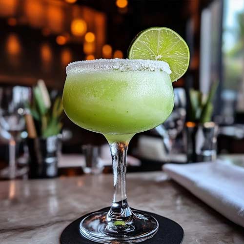 J35 Citrus Vodka, pineapple juice, lime juice, green apple syrup, and Sprite. Garnished with a Bordeaux cherry.